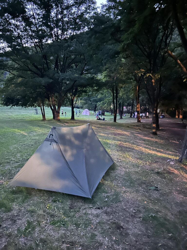 300 meter van de gebedsplek is er een picknickplek, waar je mag kamperen. Er staat nog één ander tentje, er is een kampvuurtje en zo’n 20 volwassenen en kinderen vermaken zich prima. Ik word meteen uitgenodigd om later bij ze te komen zitten, ze hebben genoeg te eten en te drinken.