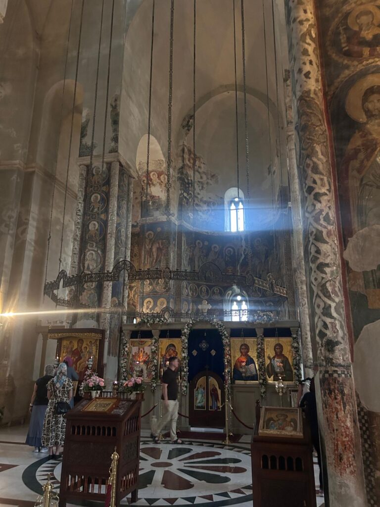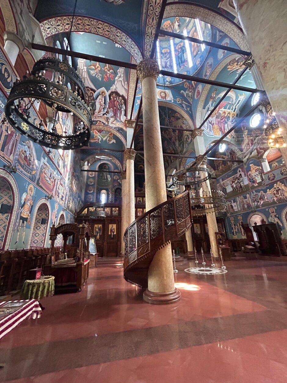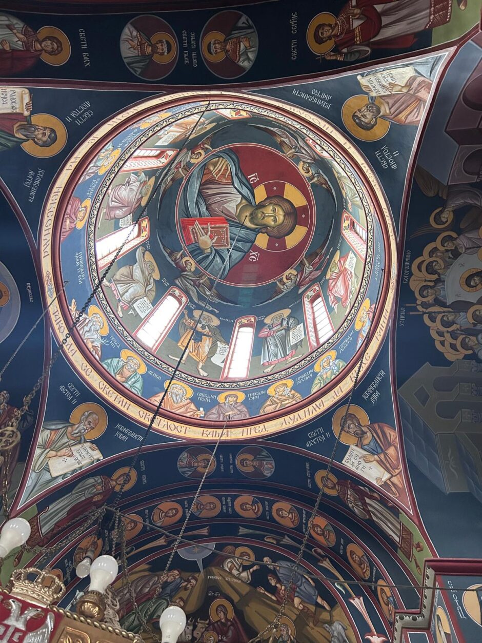 De kathedraal van Niš is indrukwekkend. Waar je ook kijkt zijn schilderingen; op de muren, op het plafond, in de raamkozijnen, overal. De kleuren zijn sprekend en het zijn verhalende taferelen. Ook hier ben ik weer de enige toerist. De kerk wordt vooral bezocht door gelovigen van de stad zelf en dat zijn er veel, te zien aan de kaarsjes die branden.
