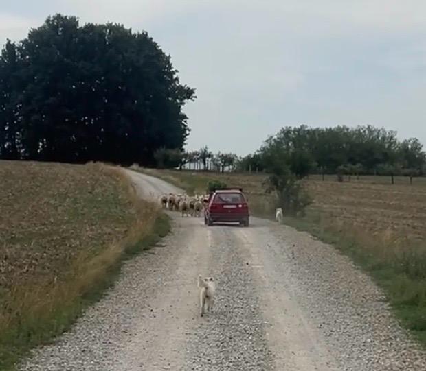 Verbaasd ben ik als er op een gegeven moment een schaapskudde achter me loopt. Er lopen twee honden bij om de schapen in het gareel te houden, maar de schaapherder rijdt er op zijn dooie gemakkie achteraan in een autootje. Zijn schoenzolen zullen niet snel verslijten.
