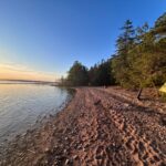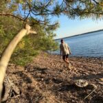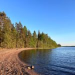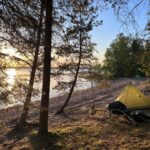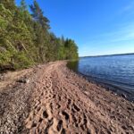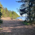 I start looking for a place to sleep. I check the Komoot app and spot a beach not far off route. Sounds promising, though the path to it is a bit tricky—I hope I won’t have to turn back. But no, what a reward, what a spot! I feel like Robinson Crusoe on a deserted island. At first there’s a small boat with a family onboard, but they soon leave. I dip my feet in the water—still too cold to swim. Now I’m all alone again, and oh, the richness of it. A beautiful beach, my tent on a bed of moss, only the sounds of nature around me, and a stunning sunset. No more words needed.