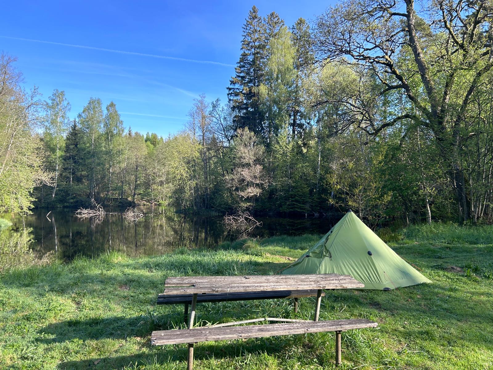 Encontrar un sitio donde acampar no es tan fácil hoy. O hay casas cerca, o el terreno está lleno de baches, o queda justo al lado de la carretera. Cuando creo haber encontrado un buen sitio, me doy cuenta del engaño: parece césped, pero justo debajo es pura roca—no hay forma de clavar las piquetas. Con mi mentalidad de ‘polder’ ni se me ocurrió comprobarlo antes. Una lección más. Recojo todo a toda prisa y sigo. Por suerte, encuentro otro sitio un kilómetro más adelante. En plena penumbra monto la tienda. Justo a tiempo.